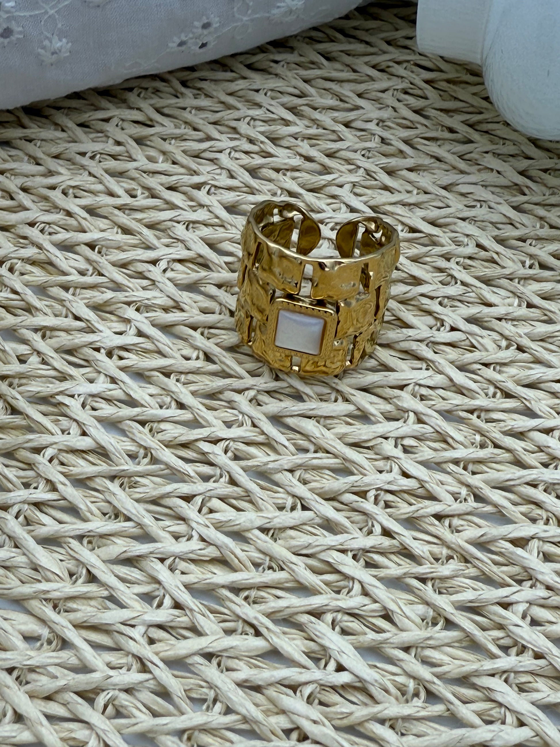 Bague ajourée , au centre une perle carrée nacrée