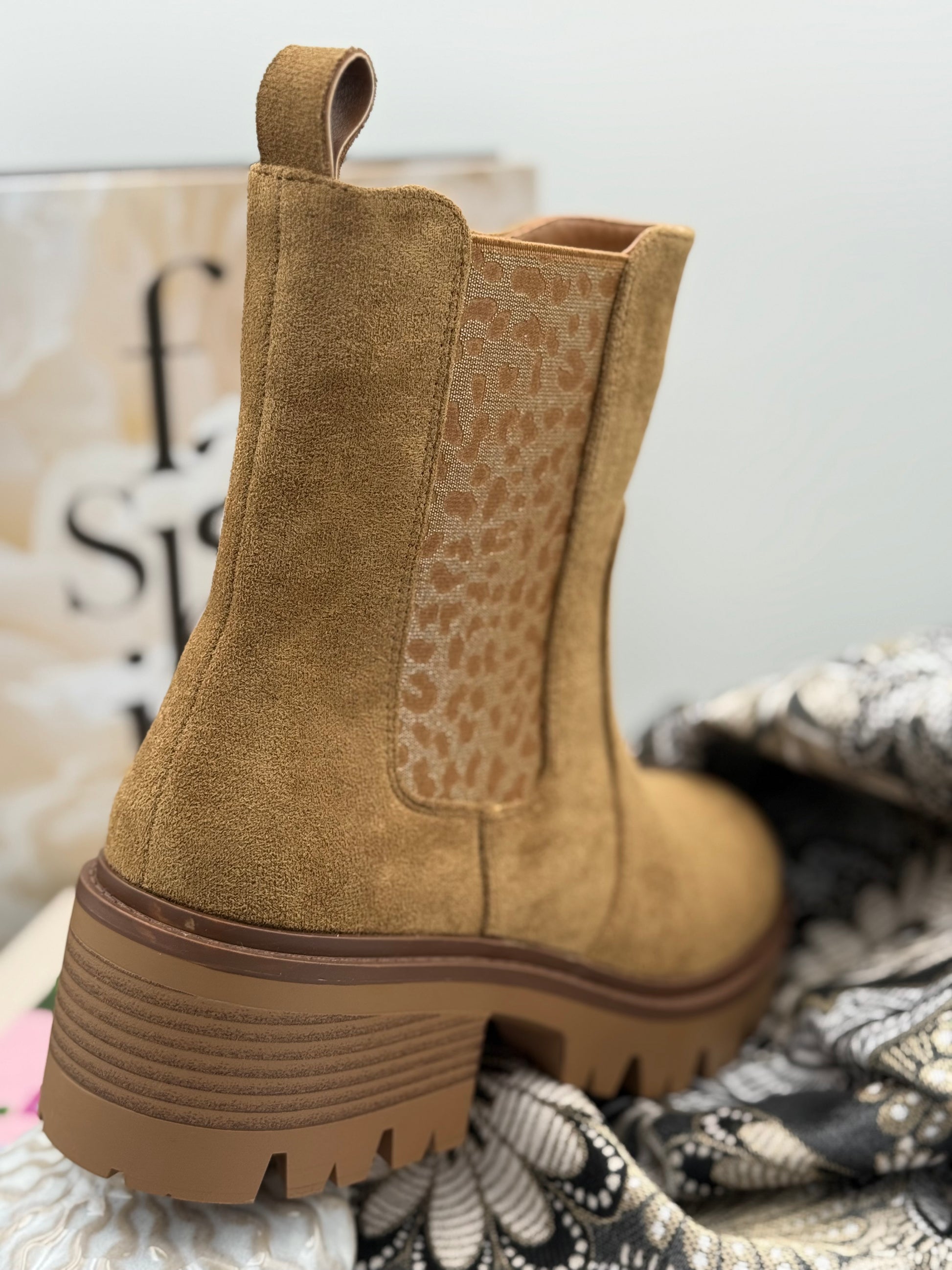 Bottine en suèdine camel avec sa touche élégante de léopard